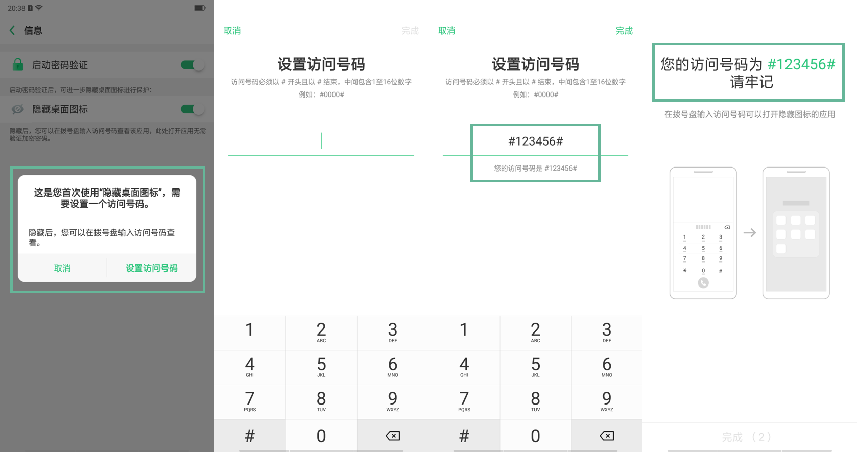 首次开启【隐藏桌面图标时】,会弹窗提醒【设置访问号码】
