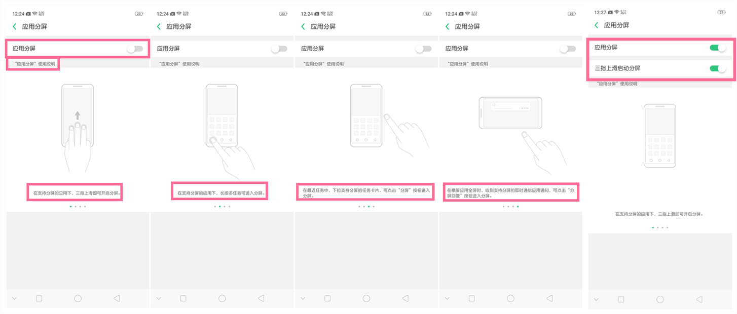 2、进入相应的界面,可以看到应用分屏的使用说明,打开【应用分屏】、【三指上滑启动分屏】相应的开关。