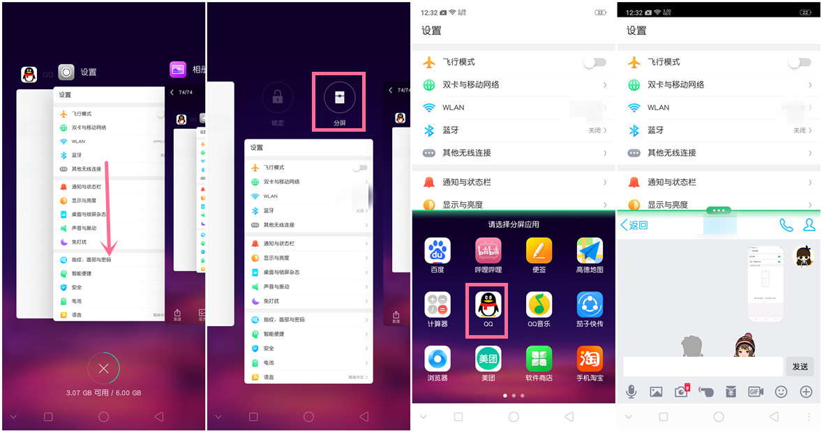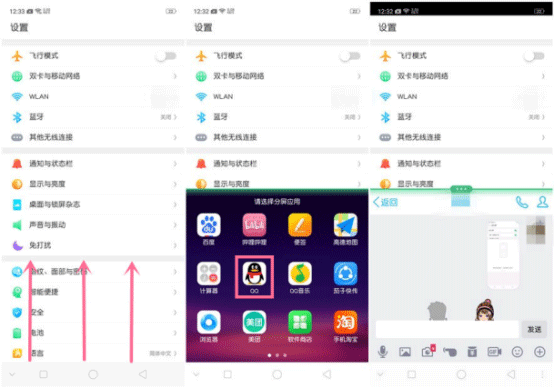分屏方式1:在支持分屏的应用下,三指上滑即可开启分屏。