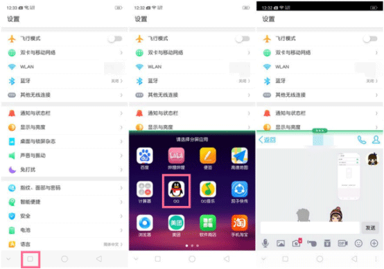 分屏方式2:在支持分屏的应用下,长按多任务(左下角的方框图标)可进入分屏。