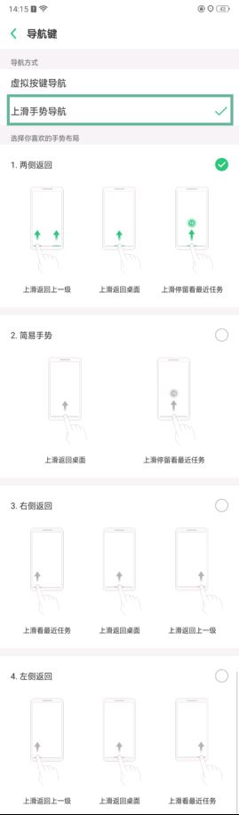 2、选择【上滑手势导航】,可以看到有4种不同模式的,你可以按照自己的习惯来进行选择使用。