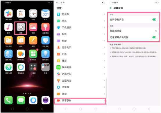 6、如果想录下声音,或者调节录制画面,可以通过桌面的【设置】--【屏幕录制】进入,然后进行相关设置即可。
