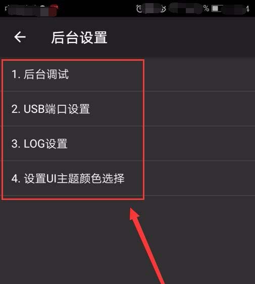 4、进入后台设置,有后台调试、USB端口设置、LOG设置和设置UI主题颜色选择四个选项。