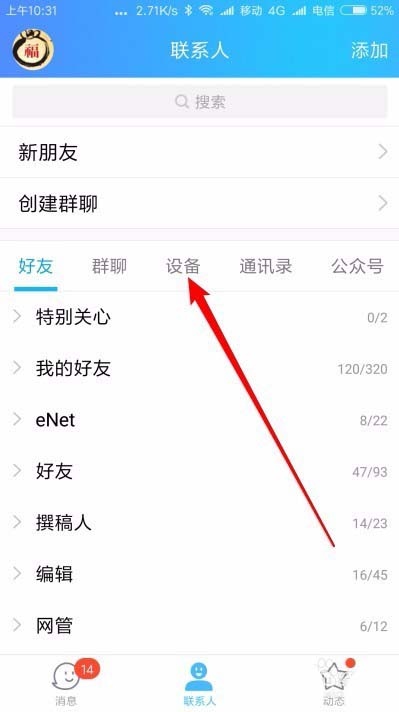 2、然后切换到QQ的联系人页面,点击页面中的“设备”选项卡。