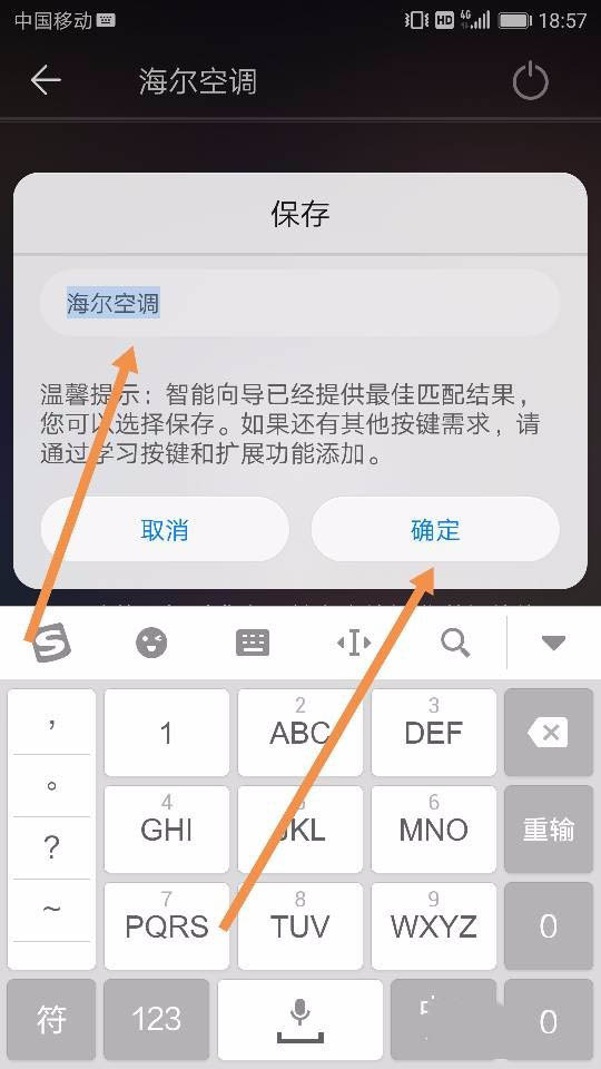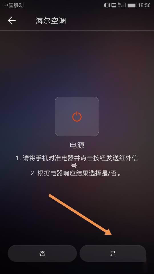 3、手机对准我们想要控制的空调主机,确保空调主机处于待机状态。然后按照软件对应的提提示 在电源和模式这两个界面分别点击 是 即可。点完后,我们给这个即将被我们控制的空调主机命名,根据自己的喜好来选择具体名字,也可以选择默认命名,点击确定即可,如图所示~