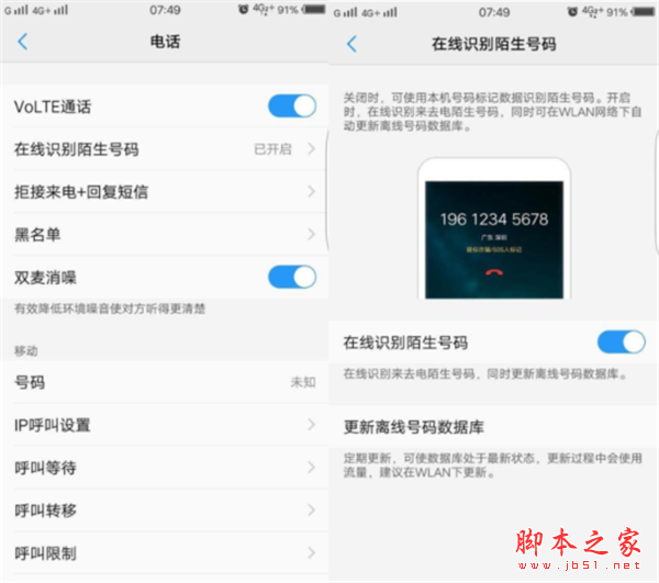 打开vivox21手机中的系统【设置】→【电话】→开启在线识别陌生号码,在收到陌生来电时,系统会自动提示识别的陌生号码,还支持更新离线号码数据库,随时随地让你免除骚扰。