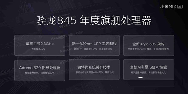 骁龙845是高通推出的旗舰 SOC芯片,这颗处理器采用第二代三星10nm LPP FINFET工艺,4个性能核心+四个能效核心,大核主频为恐怖的2.8GHz,而小核主频则为1.8GHz。,内置Adreno 530图形处理器。
