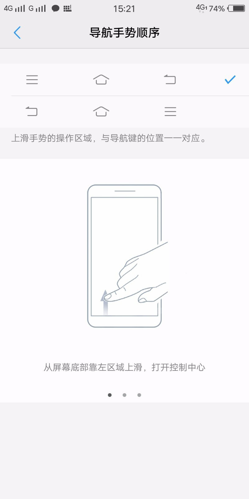3、点击后,当前显示两种导航方式的下面一种,在底部三个位置上滑分别对应控制中心、待机界面、返回上一级,操作如下图。