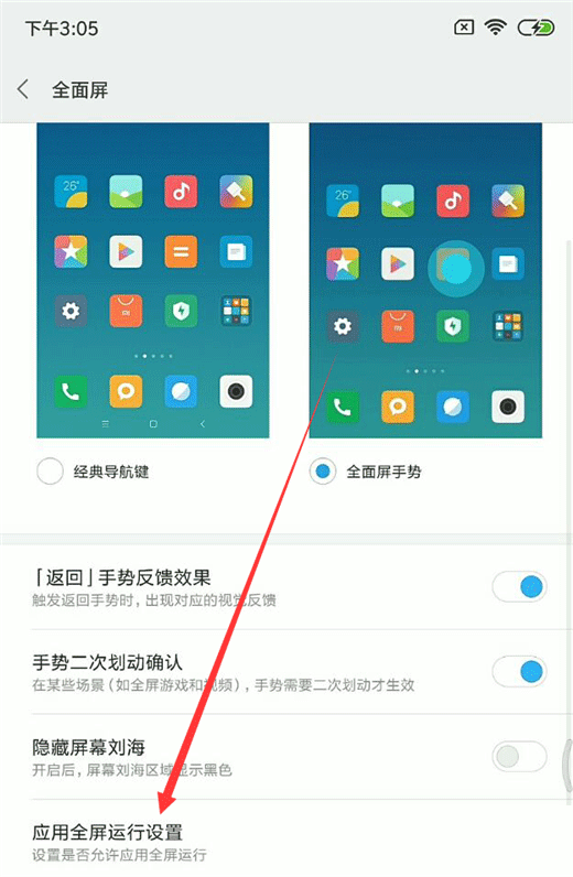 第三步:在全面屏界面选择【应用全屏运行设置】一项,点击并打开此选项。