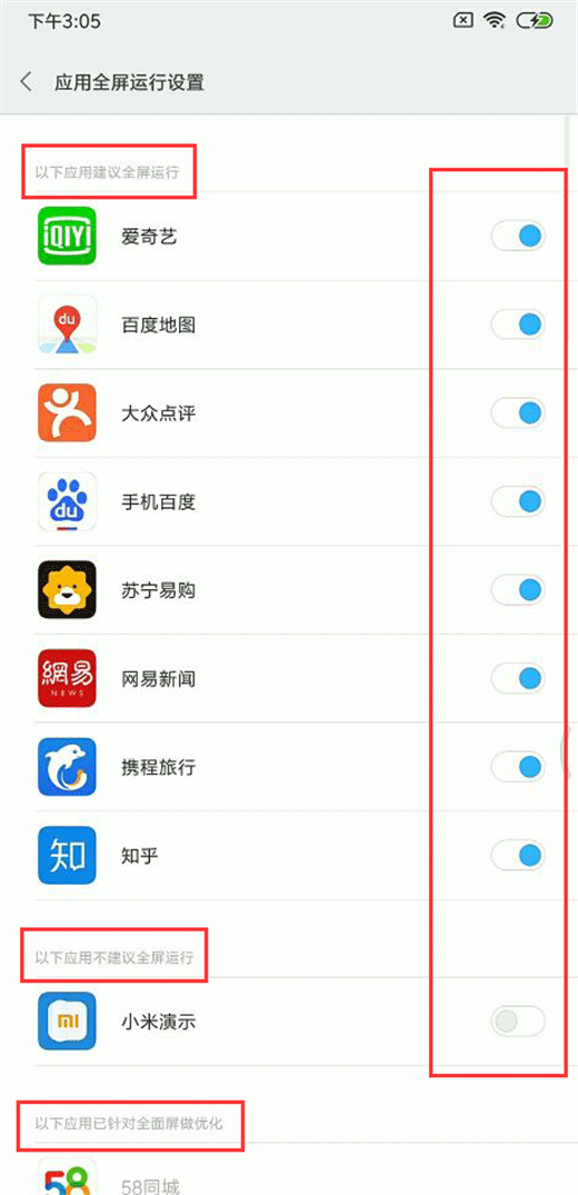 第三步:在应用全屏运行设置界面,可以看到建议全屏运行的应用,打开需要全屏运行的应用即可。