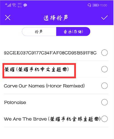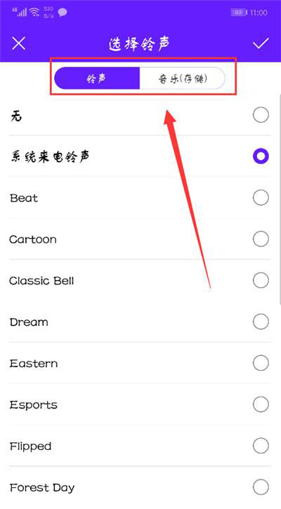 3.进入【默认铃声】之后就是【选择铃声】界面,你可以选择【铃声】或者音乐,然后再选择
