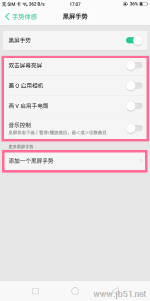4、然后可以根据需求,开启相应的开关设置,如果想另外设置,可以点击【添加一个黑屏手势】。