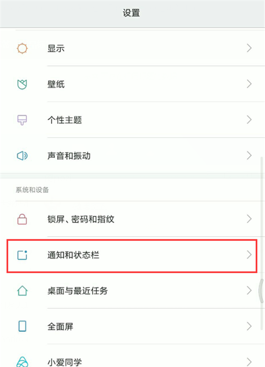 第二步:在设置界面下拉,找到【通知和状态栏】点击打开
