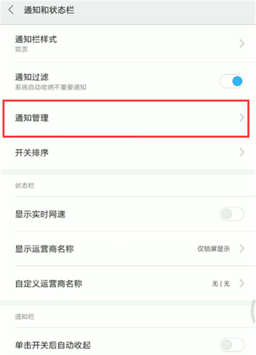 第三步:点击【通知管理】选项,如果是正在通知栏的通知,直接长按该消息也可以直接进入该应用的通知管理。