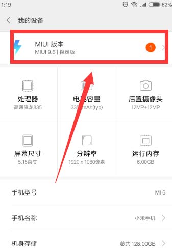 3、在我的设备内点击最上方的MIUI版本(如下图)。