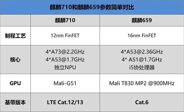 相对麒麟659, A73单核性能是A53的2倍左右, GPU是 Kirin 659的2.26倍。Kirin 710芯片的ISP也得到了升级,同时新增独立的DSP芯片专门用于图像处理,相比上一代芯片提升30%。