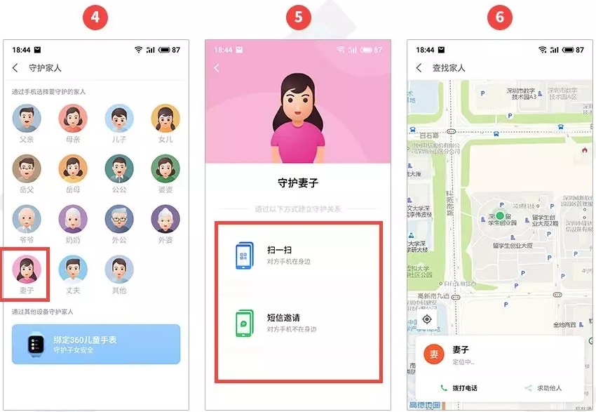 2、之后选择需要守护的家人,比如父母、儿女、妻子等等,下面以守护“妻子”,然后进行邀请,对方可以扫一扫或者接受短信邀请。之后,在查找家人中,可以定位对方的位置、拨打电话,另外还可以求助他人,如下图所示。