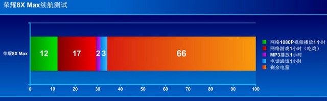 续航方面,通过实测,荣耀8X Max在进行4小时重度使用(1小时游戏、1小时视频、1小时通话、1小时听歌)测试后,电量剩余66%。玩吃鸡游戏耗电最快,1小时耗电17%,而播放1小时1080P视频,则耗电12%。