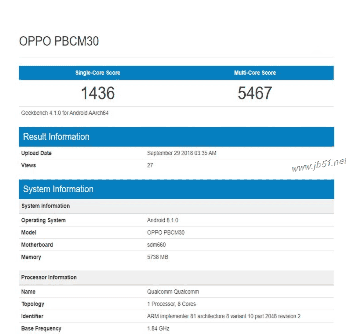 Geekbench上OPPO K1手机型号为PBCM30,这与此前入网工信部的新款OPPO手机型号一致。图片显示,oppok1单核跑分为1436,多核跑分为5467,而且该机搭载骁龙660处理器。