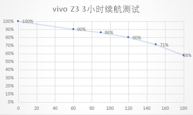 从实测数据来看,三小时重度使用后,vivoZ3剩余电量为58%,相当于一小时掉电 14% ,续航表现相对来说,中规中矩。对于中轻度使用用户来说,续航一天完全没问题,重度用户相对有些压力。