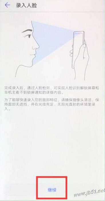 点击屏幕下方的【继续】进行录入人脸,手机正对着脸按提示完成录入,一定要确保光线充足,环境里没其他人入镜!录入后即可设置人脸解锁。