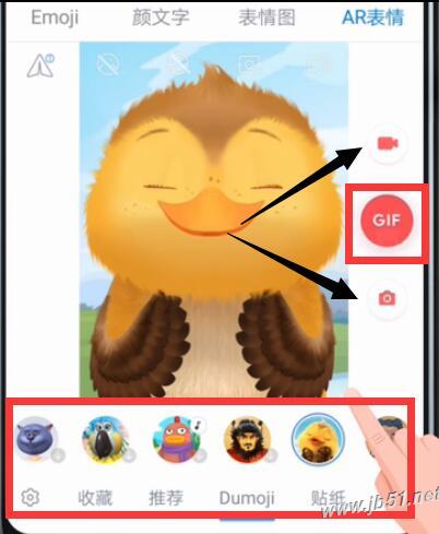 3、然后我们在屏幕下方点击选择一个自己喜欢的表情,还可以点击【GIF】来下载动图,或者点击右侧的相机、录像图标,来拍自己的静态或动态表情包,