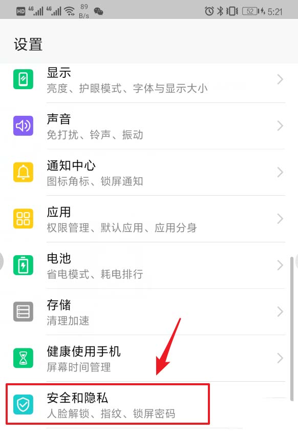 2、在手机的设置选项内,我们通过下滑界面,找到安全和隐私的选项,点击进入该选项。