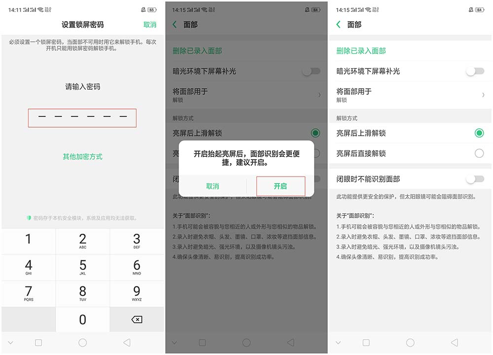 2、2、会出现设置锁屏密码的界面,设置相应的锁屏密码后直接进入【录入面部信息】界面,再根据提示进行相关面部信息录入,完成后会出现以下相关提示,点击【开启】即可完成设置。