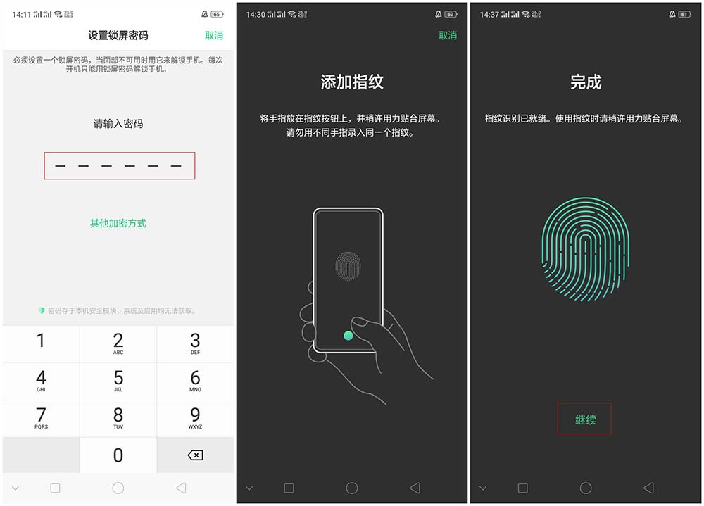 2、会出现设置锁屏密码的界面,设置相应的锁屏密码后会直接进入录指纹界面,根据提示进行相关录入即可,后续想解锁就可以用指纹进行解锁咯。