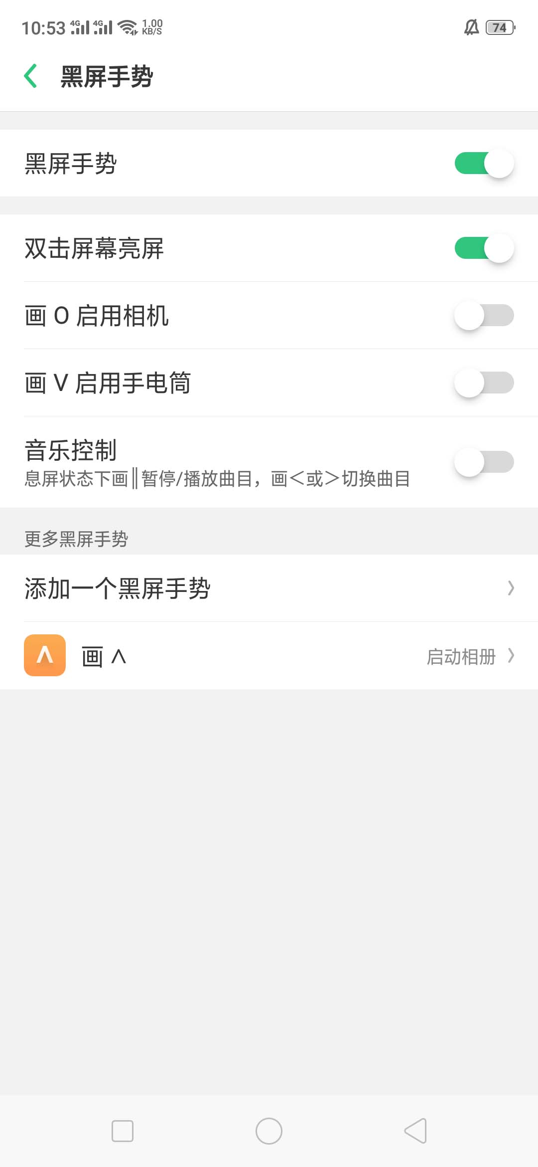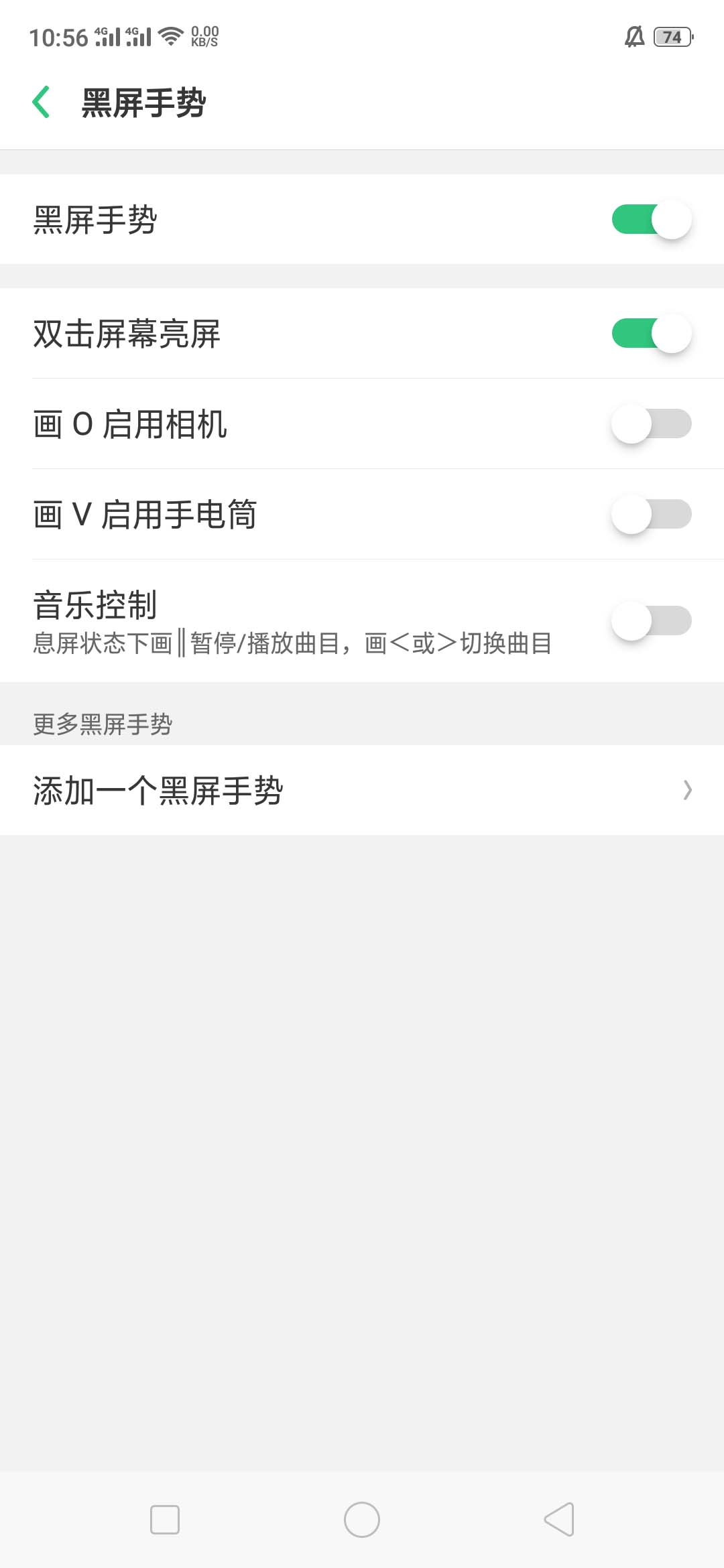 2、打开【黑屏手势】开关,然后可以根据需求,开启相应的开关设置;如果想另外添加黑屏手势,可以点击【添加一个黑屏手势】进入。