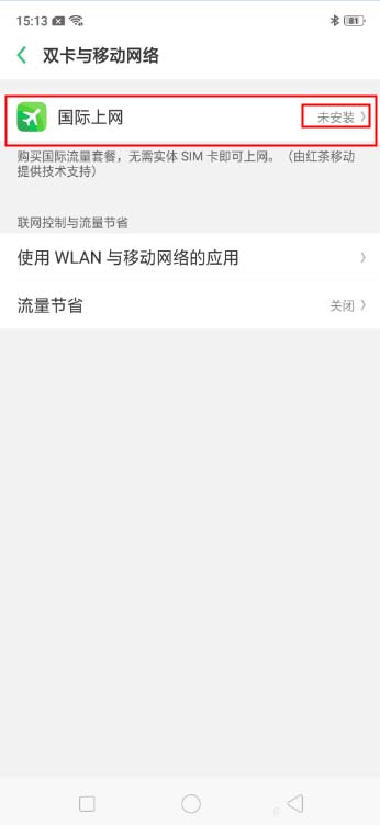 1、打开手机设置--双卡与移动网络--国际上网--点击安装。
