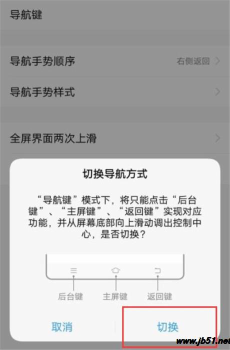 在导航方式一栏,点击【导航键】,底部会出现一个提示框,点击【切换】即可。
