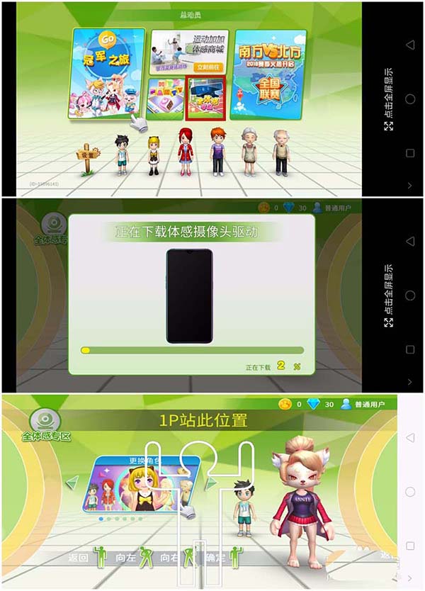 5、打开之前下载安装的【体感总动员】,点击【全体感专区】进入后会自动下载安装体感摄像头驱动,横屏下点击右侧的全屏显示,就可以进行体验咯。