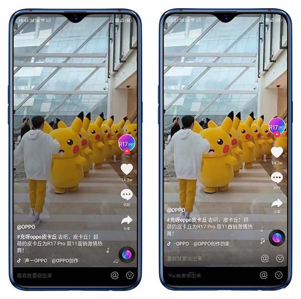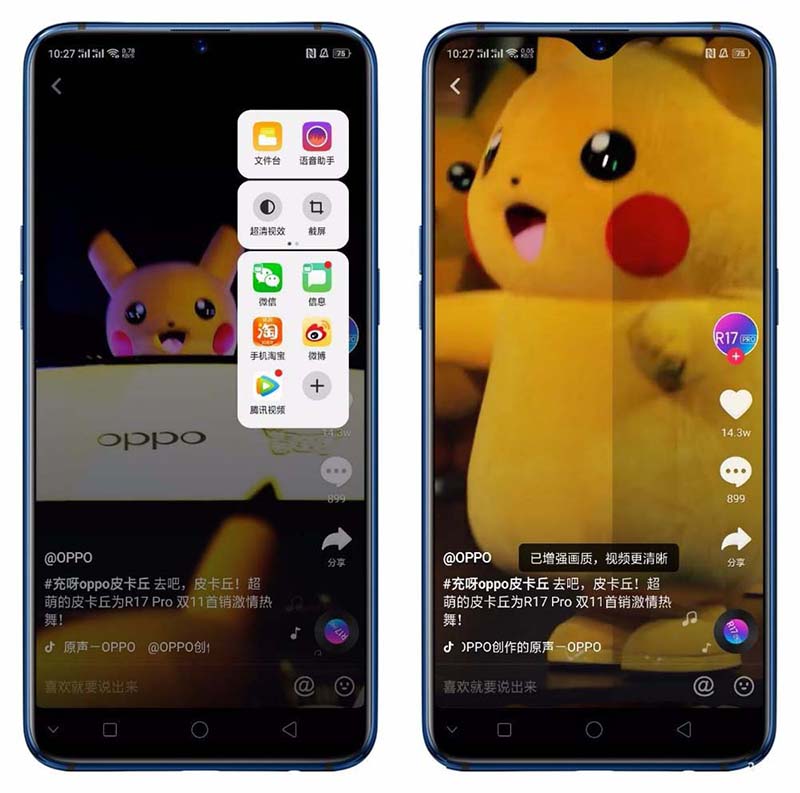 3、这时,当你在玩抖音时,将OPPO R17 Pro系统右侧的快捷侧边栏开关向外滑出。当OSIE超清视效功能开启,在观看短视频就不会是简单粗暴的直接跳转,而是从左至右逐渐优化呈现,画质有明显提升。如下图所示↓