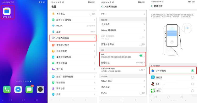 1、通过桌面的【设置】--【其他无线设置】--【NFC】--打开NFC开关--点击【触碰付款】--选择【OPPO钱包】。
