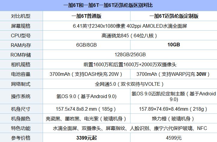 首先来看看一加6T迈凯伦版跟普通版配置对比,区别如下: