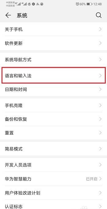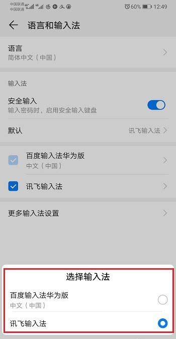 4、进去语言和输入法界面之后,可以看到当前的默认输入法,一般默认是百度输入法华为版,如下图所示: