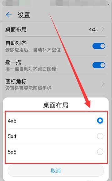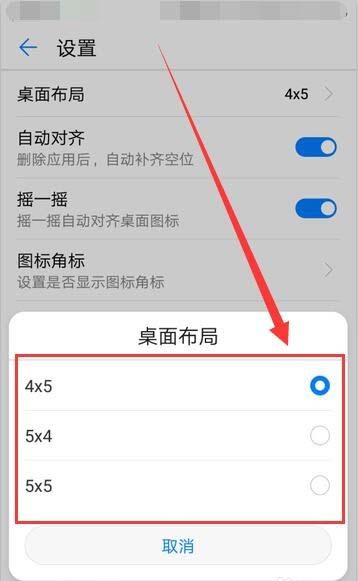 4、桌面布局窗口中,可以选择桌面布局方式,本人选择默认的4×5选项。