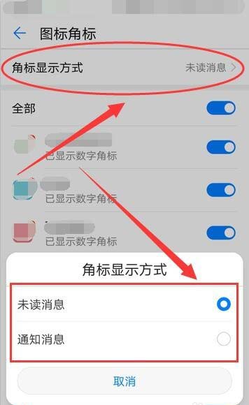 9、点击角标显示方式,可以选择角标显示未读消息还是通知消息。