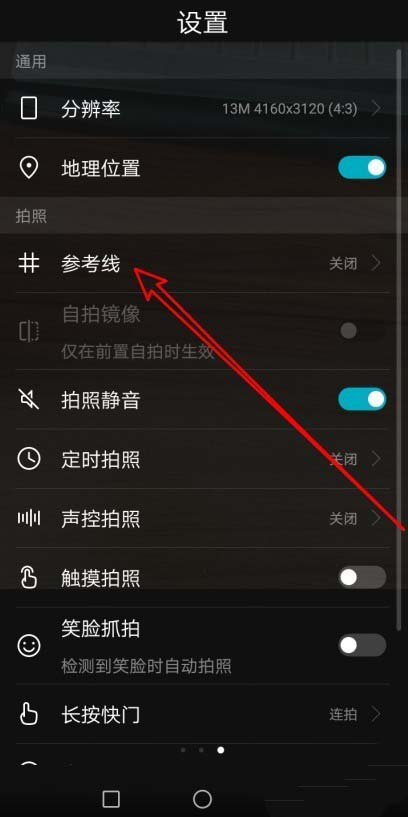 3、这时就会弹出华为手机的相机设置页面,在页面中点击“参考线”的设置项。