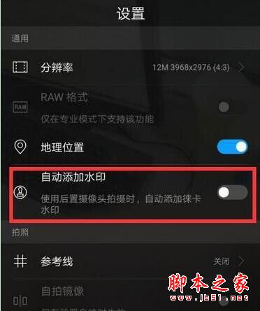 3、进入设置菜单后,找到并点击打开【自动添加水印】的开关即可在拍照时添加水印,关闭开关即可去掉水印。