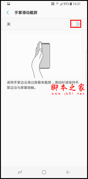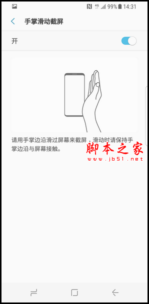 4、点击右侧滑块开关,显示“开”代表已开启。开启后,当您想要截屏时,将您的手掌从屏幕一边向另一边滑动,滑动时手掌侧面保持与屏幕接触即可截屏。