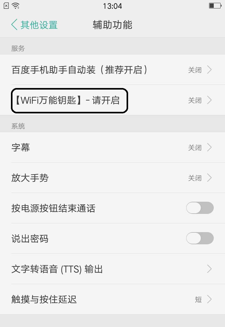 4、此时才能点击“使用”按钮后打开辅助功能界面中点击“wifi万能钥匙-请开启“选项。