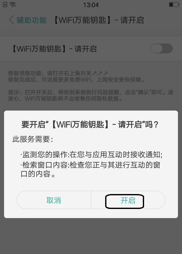 6、此时我们点击开启立即弹出”要开启【wifi万能钥匙】-请开启吗?“提示对话框中点击”开启“按钮。