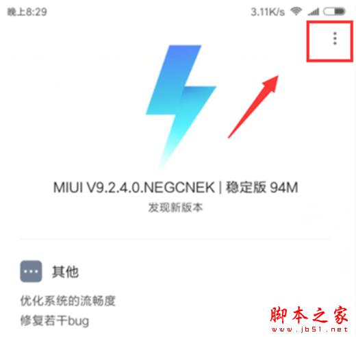 第四步:在“MIUI版本”界面,我们点击右上角的三个小圆点。