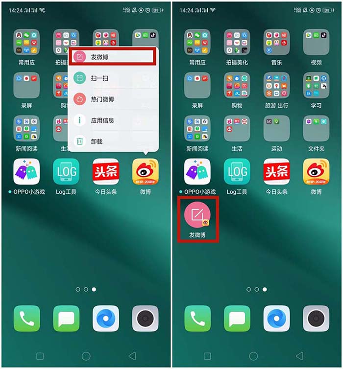 长按【微博】图标--会出现以下相应的对话框--然后长按想直接添加到桌面的快捷小功能。