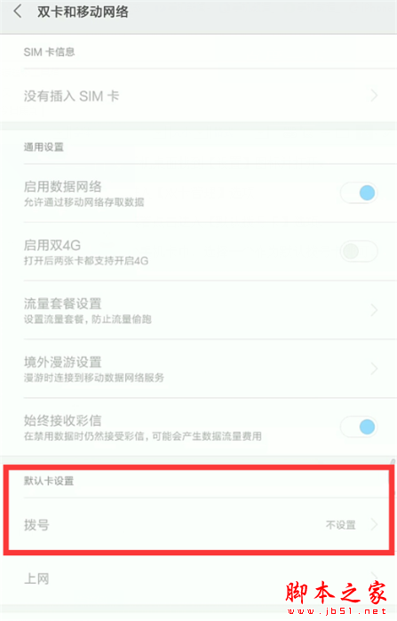 第三步:进入双卡和移动网络后,接着点击进入默认卡一栏里面的【拨号】选项