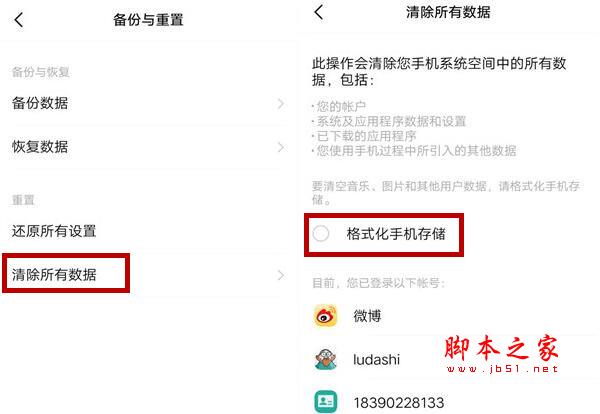 4、点击“清除所有数据”进入恢复出厂设置界面,在该页面直接点击最下方“立即清除”将会清除手机中的所有数据,但是不包括音乐、图片和用户数据。如果您想彻底删除数据的话可以勾选“格式化手机存储”,把手机初始化。