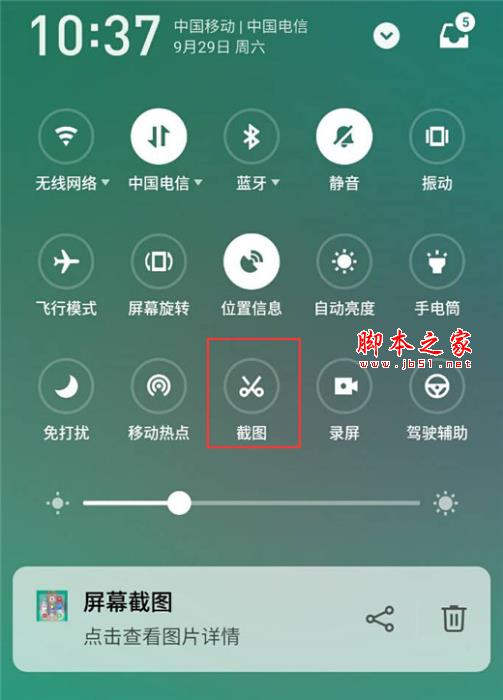 下拉通知栏,找到【截图】功能选项(如下图的位置),屏幕闪的一下即可实现截图。