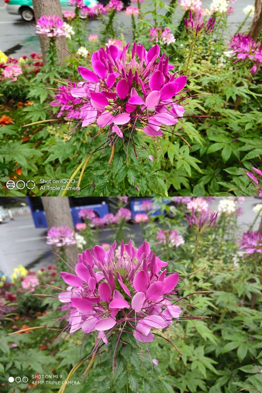 由于最近阴雨连连,即使是室外光照条件也不是很好,蓝天白云这些场景就无法为大家奉上了。不过好处是少了阳光的影响,更能体现各自的色彩表现。可以看到iQOO和小米9的成像风格还是有明显区别的,尽管两款手机都识别出是鲜花场景,但iQOO拍出的花朵更鲜艳浓郁一些,层次感也更分明。